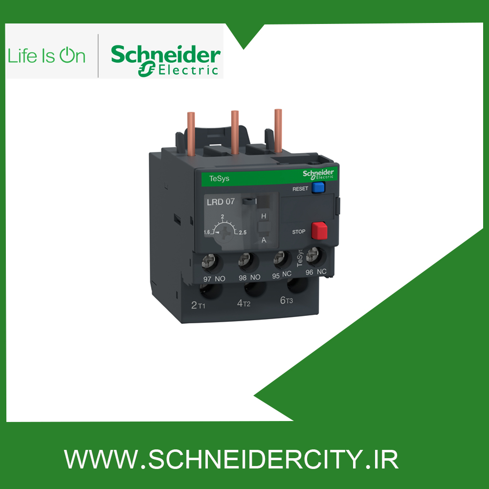 رله حرارتی TeSys LRD07 اضافه بار 2.5 آمپر690 ولت AC/DC است که در محدوده تنظیم جریان حرارتی 1.63 تا 2.5 آمپر با کلاس تریپ 10 برای حفاظت از موتورهای 3 فاز 0.12-0.18 کیلووات 400 ولت استفاده می شود. بی متال اشنایدر مجهز به سیستم تشخیص قطع فاز است. در این تجهیز می توان با یک ولوم قابل تنظیم رنج جریان را انتخاب کرد که هم با حالت دستی و هم اتوماتیک قابل تنظیم است.