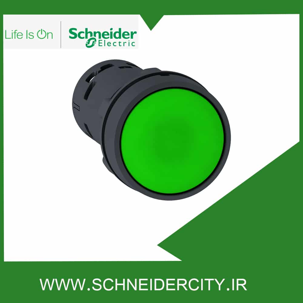 برند:اشنایدر الکتریک کد فنی:XB7EV03BP ابعاد:54mm x 29mm x 29mm جنس بدنه:باکالیت رنگ: سبز نوع: با LED داخلی 24 ولت AC قطر: 22mm درجه