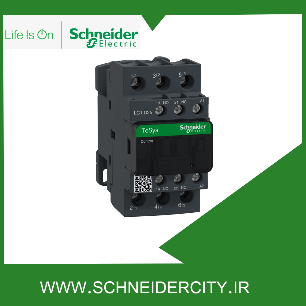 کنتاکتور 25 آمپر LC1D25E7 اشنایدر به منظور کنترل بار عمومی و موتور مورد استفاده قرار می گیرد. این کنتاکتور از نوع سه پل بوده و سه کنتاکت با قدرت NO دارد که ترکیب آن ها به صورت 1NO + 1NC است. جریان کاری این قطعه 25 آمپر و ولتاژ تغذیه بوبین یا ولتاژ کنترلی آن 48 ولت AC است.