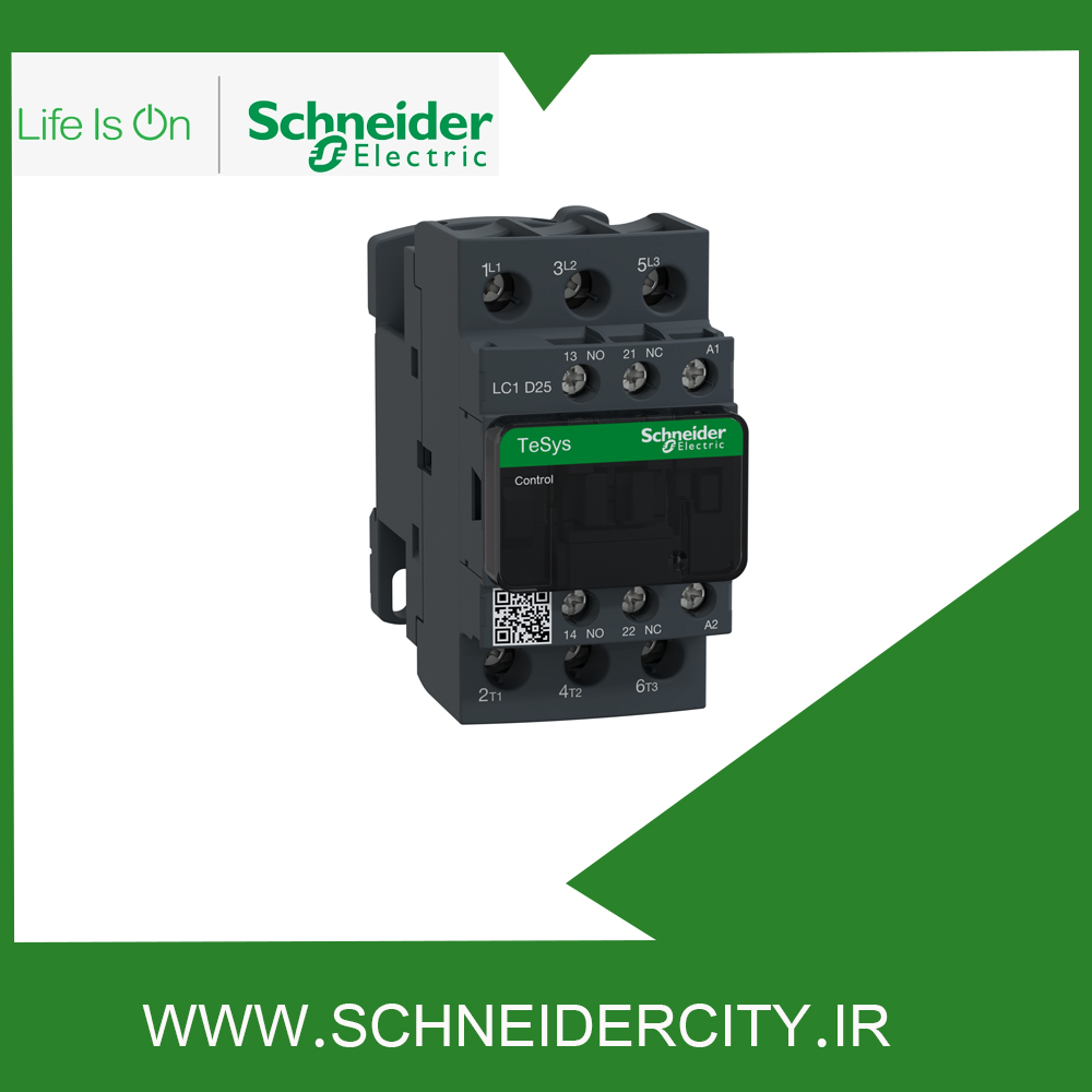 کنتاکتور 25 آمپر LC1D25M7 اشنایدر به منظور کنترل بار عمومی و موتور مورد استفاده قرار می‌ گیرد. این کنتاکتور از نوع سه پل بوده و سه کنتاکت با قدرت NO دارد که ترکیب آن ها به صورت 1NO + 1NC است. جریان کاری این قطعه 25 آمپر و ولتاژ تغذیه بوبین یا ولتاژ کنترلی آن ۲۲۰ ولت AC است.