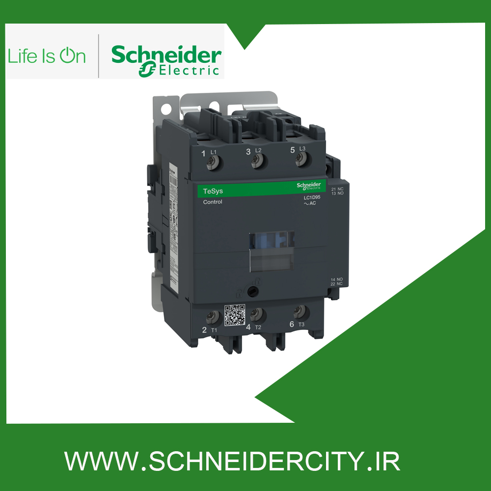 کنتاکتور 95 آمپر LC1D95B7 اشنایدر به منظور کنترل بار عمومی و موتور مورد استفاده قرار می گیرد. این کنتاکتور از نوع سه پل بوده و سه کنتاکت با قدرت NO دارد که ترکیب آن ها به صورت 1NO + 1NC است. جریان کاری این قطعه 95 آمپر و ولتاژ تغذیه بوبین یا ولتاژ کنترلی آن 24 ولت AC است.